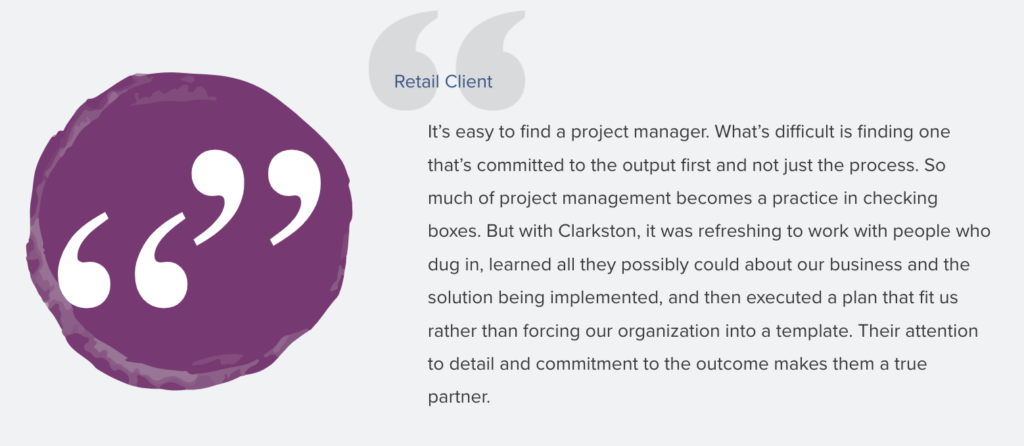 Whether you are establishing a PMO, rolling out omnichannel initiatives, or implementing a new ERP, Clarkston’s experienced consultants will drive your most strategic initiatives to achieve the intended results. We are strategic partners in retail project management and Program Management Office (PMO) governance.