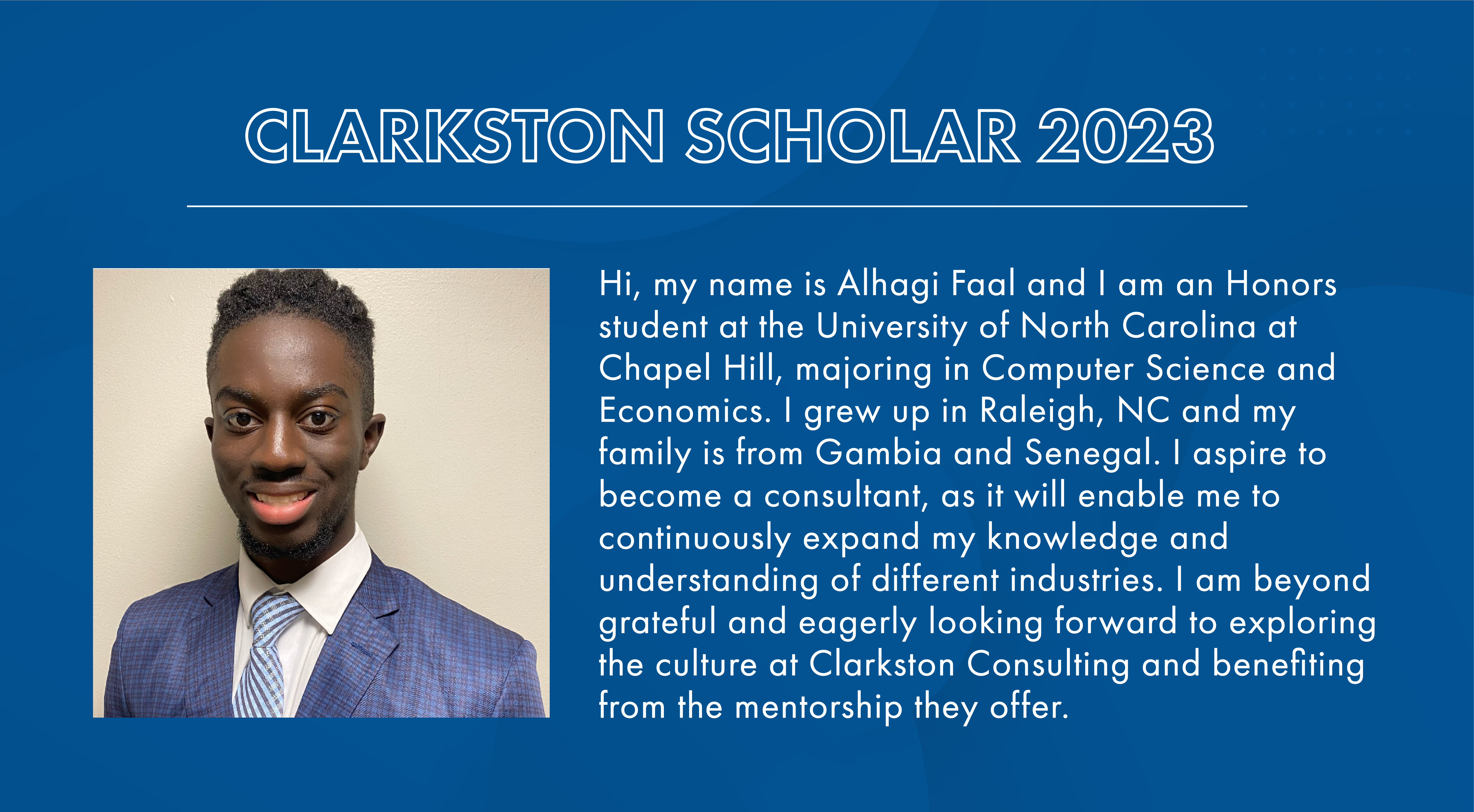 A Clarkston Scholar is a highly-driven, first-generation college student who excels in the classroom, has an interest in consulting or the industries Clarkston serves, and has demonstrated financial need. The Clarkston Scholars Program will provide one sophomore attending a four-year college/university undergraduate program at a qualifying school a $10,000 scholarship award ($5,000 per year for junior and senior year). The Clarkston Scholars Program is more than just a monetary award; it is designed to combine the financial rewards of a scholarship with the mentoring and networking opportunities available through our diverse steward and client network. The Clarkston Scholar will participate in a mentorship program with Clarkston stewards to gain exposure to the professional world and help refine their strengths and interests.